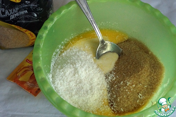 Добавить сахар и кокосовую стружку, перемешать.