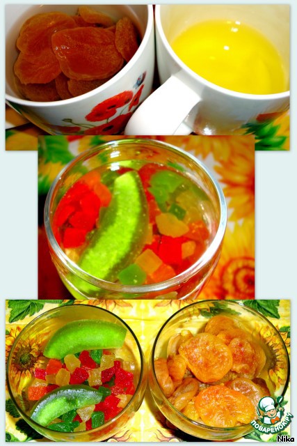 Пока занималась тестом, залила тёплой водой курагу и цукаты на 10 минут. Воду слила. Курага крупная, поэтому пришлось её разрезать на мелкие кусочки. (На приготовление теста и начинку ушло 15 минут).