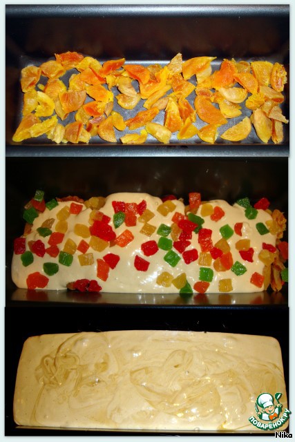 В форму для выпечки хлеба с тефлоновым покрытием выложила на дно курагу (не смазывала маслом). Затем выложила часть теста. На тесто равномерно разложила цукаты. Потом выложила остатки теста.