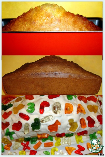 Духовку разогрела. Поставила кекс выпекаться на 25 минут при температуре 180 градусов. Кекс подрумянился. Проткнула его посередине палочкой, чтобы посмотреть, пропёкся или нет. Готовый кекс на 30 минут выставила на балкон... Взбитый яичный белок пока постоит в холодильнике... Кекс остыл. Теперь можно украшать. Обмазала белком. Очередь за жвачками и тянучками.