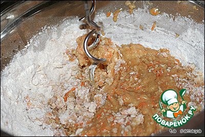 Размешать яйца, добавить сахар, ванильный сахар, растительное масло и хорошо размешать. После чего добавить морковь, кокос и перемешать. Просеять вместе муку, соду, корицу и добавить к смеси. Перемешать до получения однородной массы. Добавить орехи и цукаты, перемешать.
