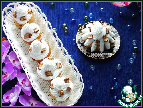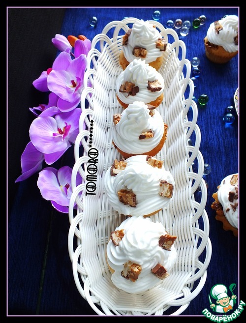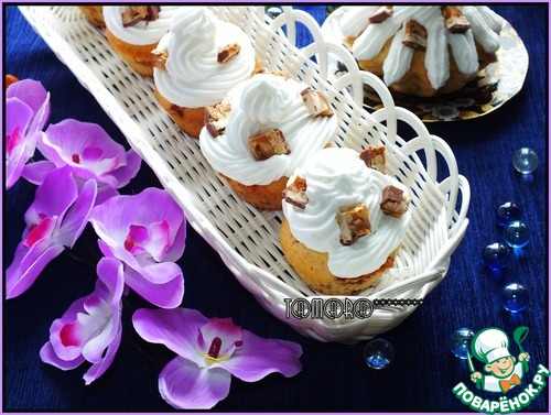 Формочки смазать растительным маслом (у меня силиконовые). Наполнить тестом чуть больше половины. Выпекать кексы в горячей духовке при t-180* - 20 минут. Готовность проверить деревянной палочкой. По готовности остудить. Сделать крем из взбитых сливок, согласно инструкции на пакетике. Крем выложить в кондитерский мешок и сделать красивые "шапочки", затем украсить кусочками сникерса.
