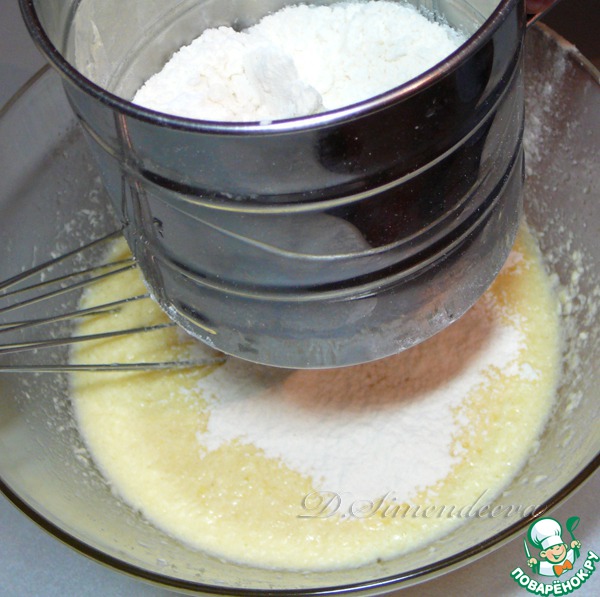 Просеять муку со щепоткой соли и с разрыхлителем. В сахарно- яичную смесь попеременно добавить муку.