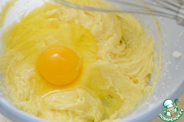 1. Сливочное масло взбить с сахаром. Взбивая добавить по одному яйца.