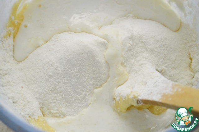 2. Муку просеять с крахмалом, разрыхлителем и солью. Кефир смешать с растительным маслом. В яичную смесь ввести половину муки и половину кефира. Перемешать лопаткой. Затем вторую половину муки и кефира. Перемешать.