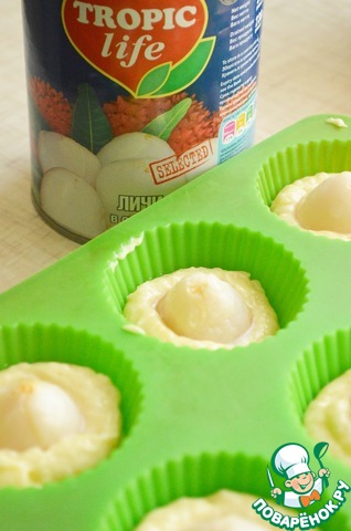 3. Тесто разложить по формочкам, заполняя на половину. Затем в каждую формочку выложить по плоду личи и сверху выложить остальное тесто.