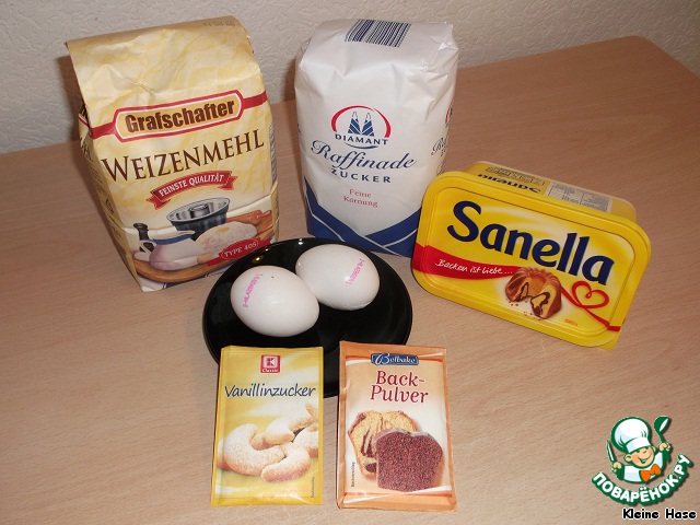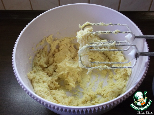 Два желтка взбиваем с остальным сахаром (55гр.), добавляем размягчённое масло или маргарин, ванильный сахар и соль. Всё это взбиваем миксером на малых оборотах до кремообразного состояния. Муку смешиваем с разрыхлителем и вводим,просеивая, в тесто.