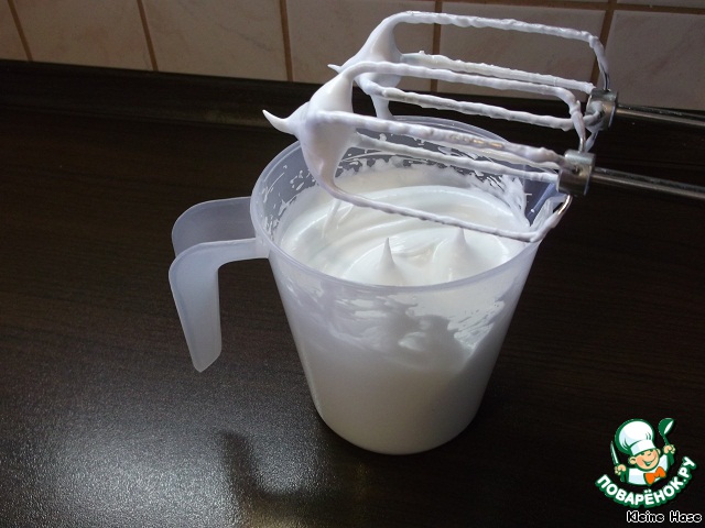 Белки взбиваем с половиной нормы сахара, т.е. с 55 гр.сахара, до пиков.