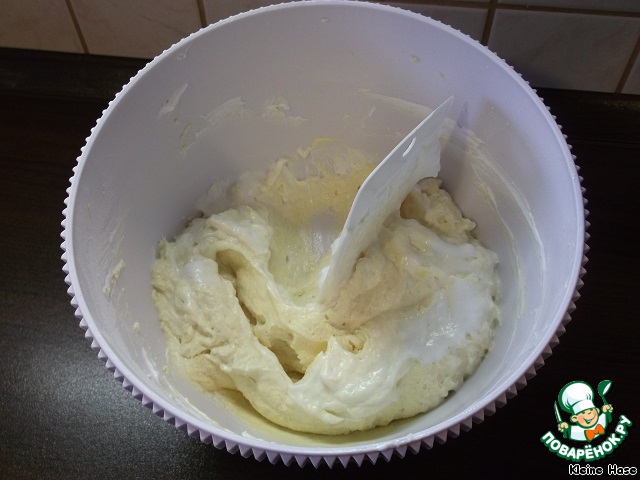 Взбитые белки осторожно соединяем с тестом и сверху вниз лопаткой ложкой) перемешиваем до однородного состояния.