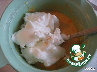 И осторожно ввести взбитые в крепкую пену белки со щепоткой соли,