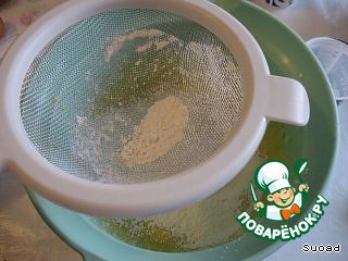 Влить йогурт и просеянную муку с разрыхлителем, крахмал, цедру и сок апельсина