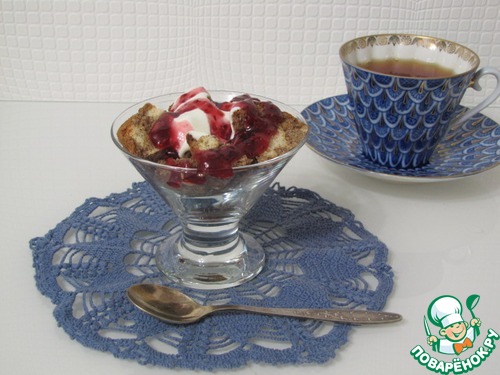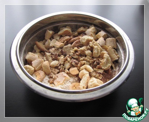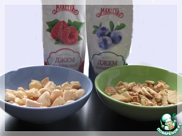 Для начала пороемся в своих закромах, найдем остатки печенья, вафель, пряников, поломаем в крупную крошку. И приготовим джем. Идеален для этого случая джем марки "Махеев". Его большой ассортимент позволит приготовить разные по вкусу пирожные.