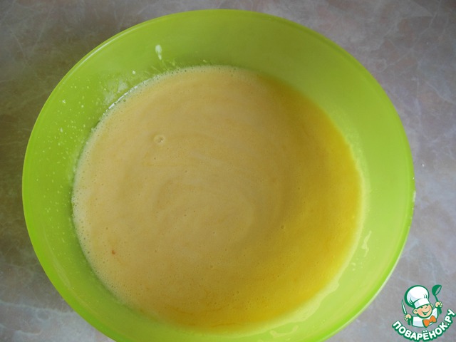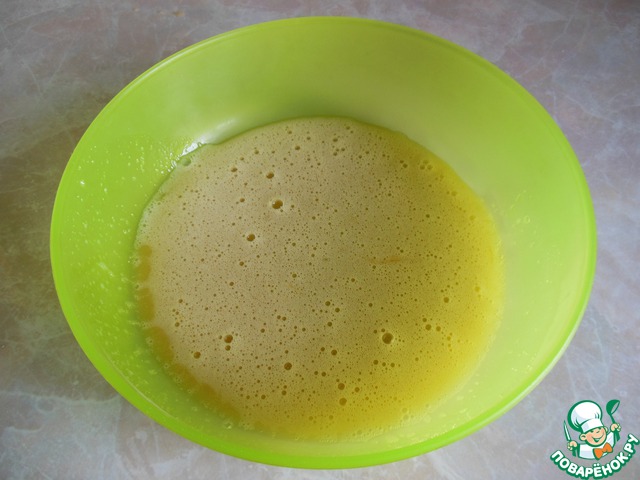 Взбить венчиком яйца и сахар. Влить кефир, размешать. Добавить ложку соды, перемешать.