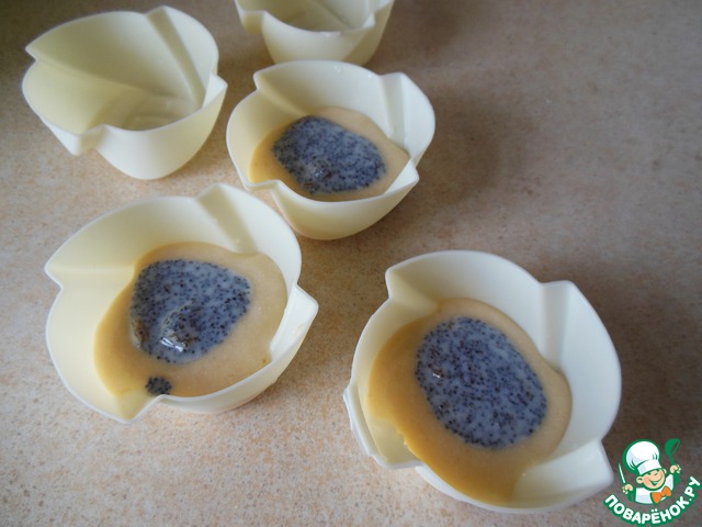 Далее слоями заливаем тесто в формочки (тесто, начинка, тесто).