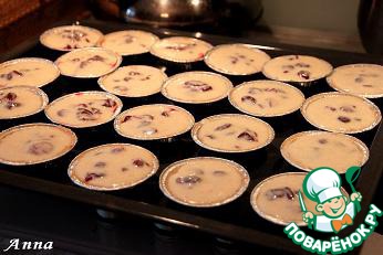 Приготовить заливку: для этого смешать сметану, яйцо и сахар, постепенно всыпать муку и размешать до однородного состояния, чтобы не было комочков. Залить заливку в формочки. Выпекать при 180 градусах в маленьких формочках 30-35 минут.