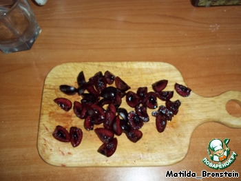 5. Черешню режем пополам, вынимаем косточки и еще раз режем.