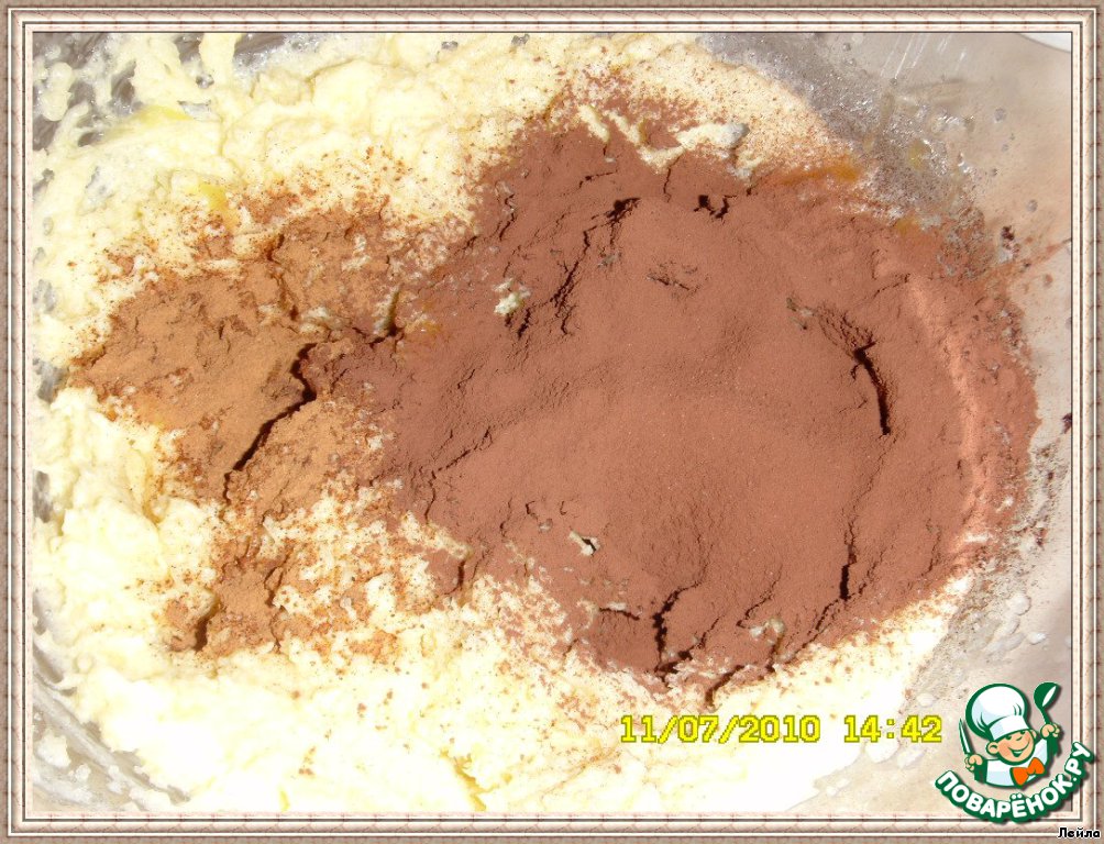 И в конце добавить мучную орехово-шоколадную сухую смесь, аккуратно перемешать ложкой(лопаточкой)
