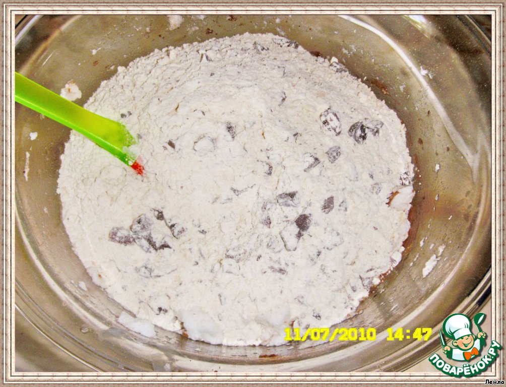 Просеять муку, добавить разрыхлитель и размельченные орехи