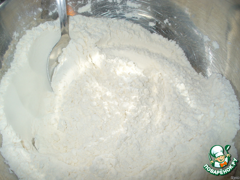Муку просеиваем в другую миску, 2 ст.л. откладываем. В миску так же просеиваем разрыхлитель и добавляем соль. Хорошо перемешиваем.