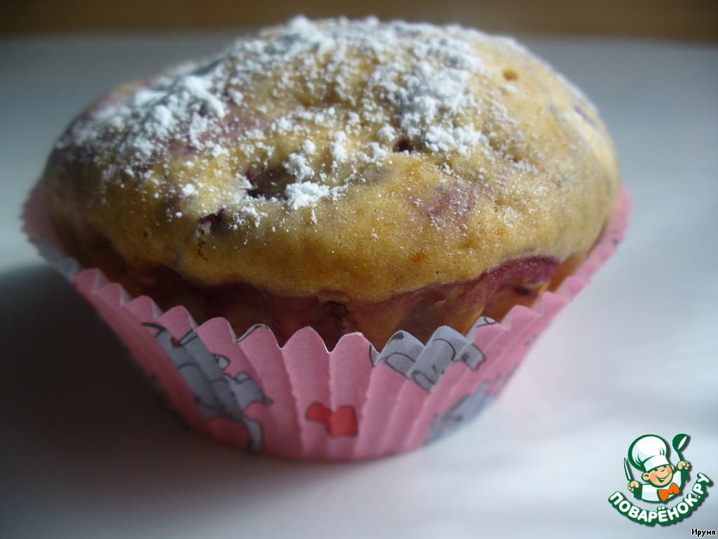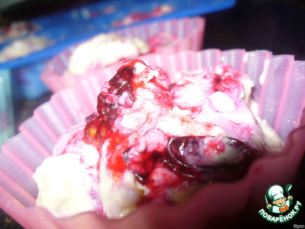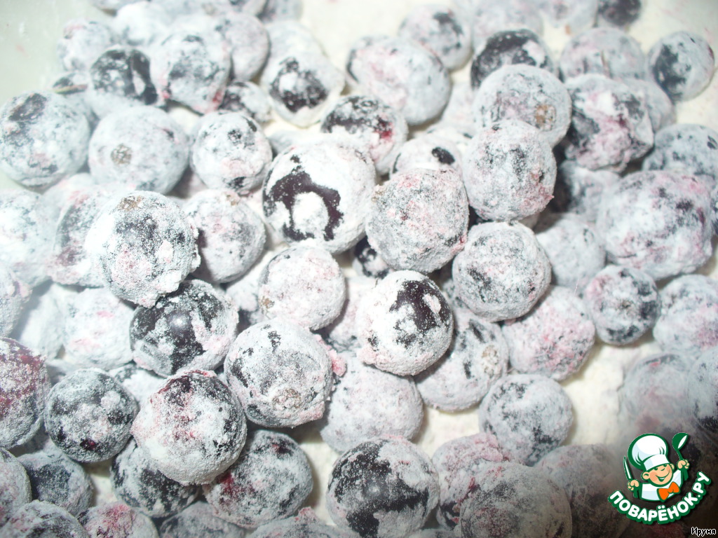 Немного оттаившие ягоды обваливаем в отложенной муке (2 ст.л.). И вводим их в тесто. Аккуратно перемешиваем.