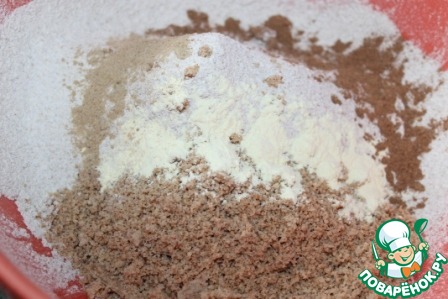 Соединяем просеянную муку, миндаль, корицу, шафран, имбирь и разрыхлитель теста, перемешиваем.