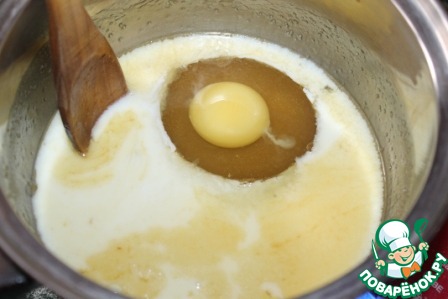 Мёд, сахар и сливочное масло ставим в кастрюльке на медленный огонь, помешивая нагреваем до растворения сахара, огонь выключаем и остужаем до комнатной температуры.