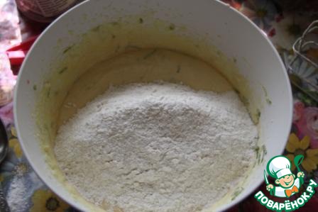 Муку просеять, смешать с разрыхлителем и сухим молоком и всыпать в тесто.