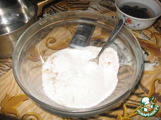 Смешать муку, корицу, кокосовую стружку, разрыхлитель, сахар, соль