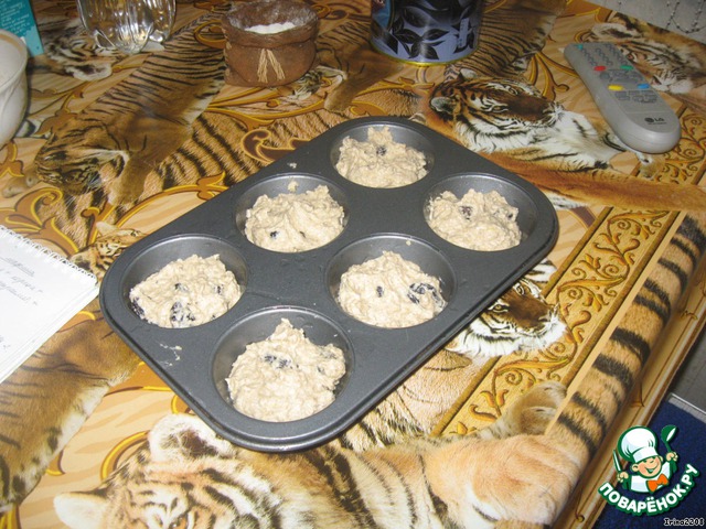 Смешать сухие ингридиенты с "мокрыми", мне показалось густовато и я долила еще кефир. Формочки для маффинов смазать маслом и наполнить тестом. Поднимается оно не сильно, так что можете смело класть больше половины формочки. Выпекать 40 минут