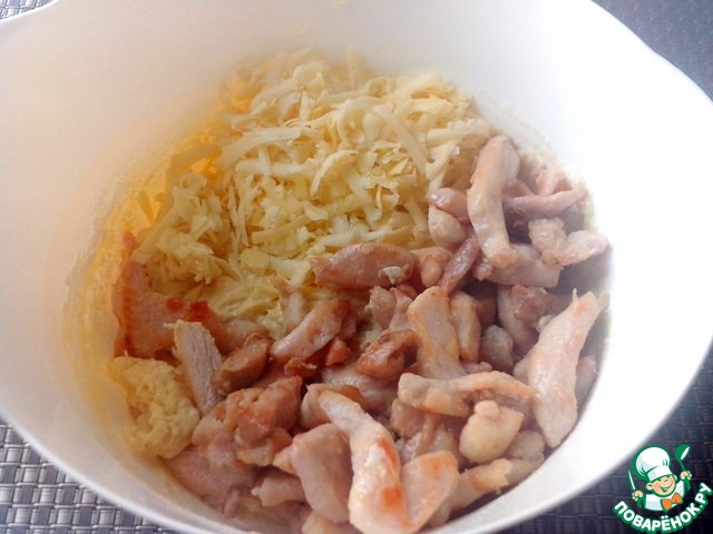 Добавить к тесту 50 г натертого сыра (20 г сыра понадобится позже) и кусочки куриного филе. Перемешать.