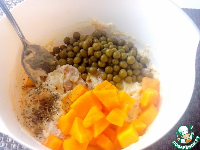 Теперь добавим к тесту овощи – размороженный зеленый горошек (я добавила консервированный зеленый горошек, предварительно слив жидкость), нарезанную тыкву, специи или пряности по вкусу (я добавила итальянские травы). Аккуратно перемешать. Вместо пряностей можно добавить немного нарезанных кусочками вяленых помидор.