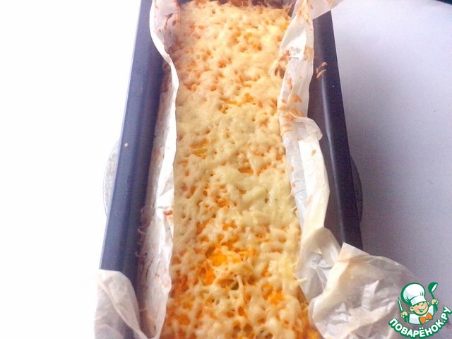 По истечении времени посыпать сверху кекс оставшимся натертым сыром (20 г) и поставить в духовку еще на минут 5-10, чтобы сыр расплавился. Дать остыть.