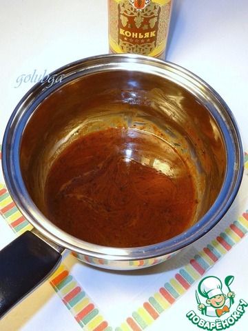 Добавить в растопленную маслянисто-шоколадную смесь коньяк и растворимый кофе (1 ч. л.), разбавленный с коньяком (1:1).