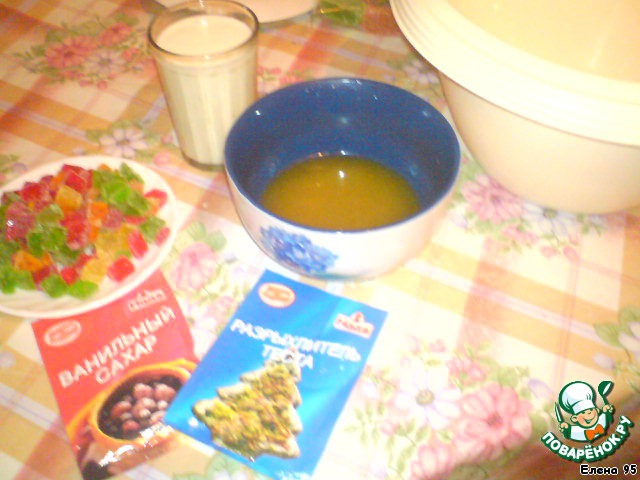В растопленный маргарин насыпаем сахар и ванильный сахар, перемешиваем. Добавляем кефир, варенье, яйцо, муку, разрыхлитель и мармелад.