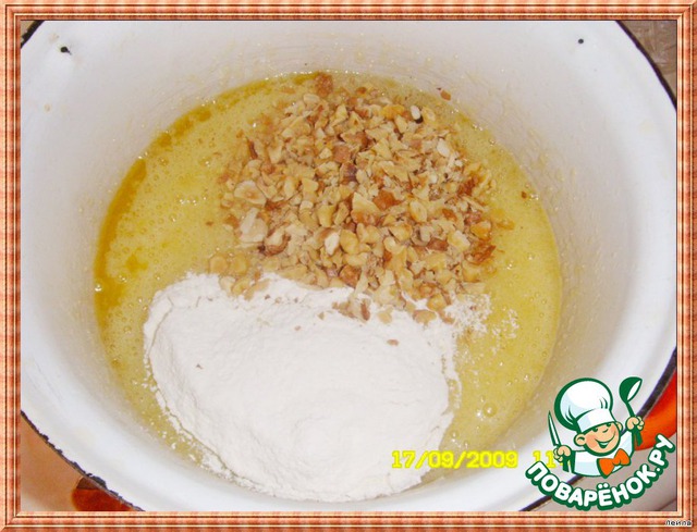 Орехи, муку с разрыхлителем. Аккуратно перемешать.