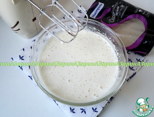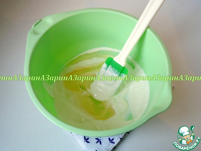 Нутовую муку смешать с разрыхлителем и просеять. Перемешать аккуратно лопаткой, что бы масса не потеряла воздушности.
