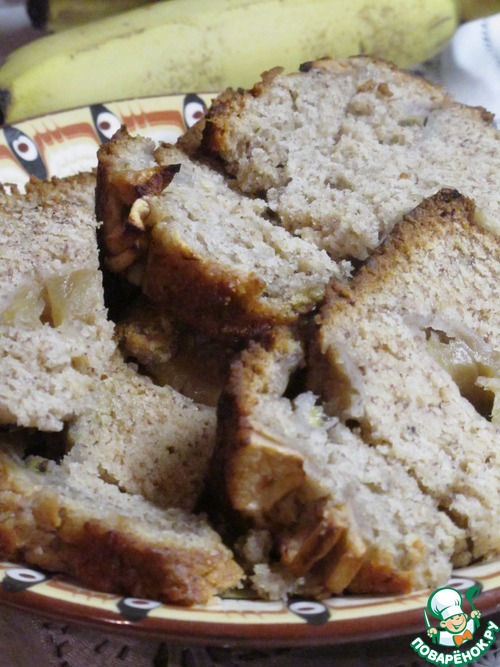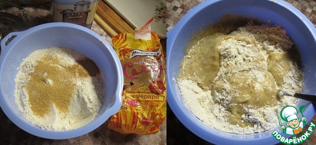 Муку смешать с разрыхлителем, специями, ароматизатором и сахаром. Добавить банановое пюре.