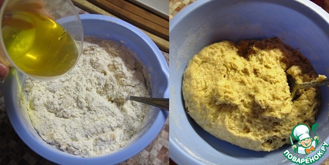 Добавить растительное масло и замесить тесто. Тесто получается очень густое.