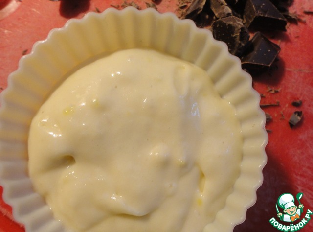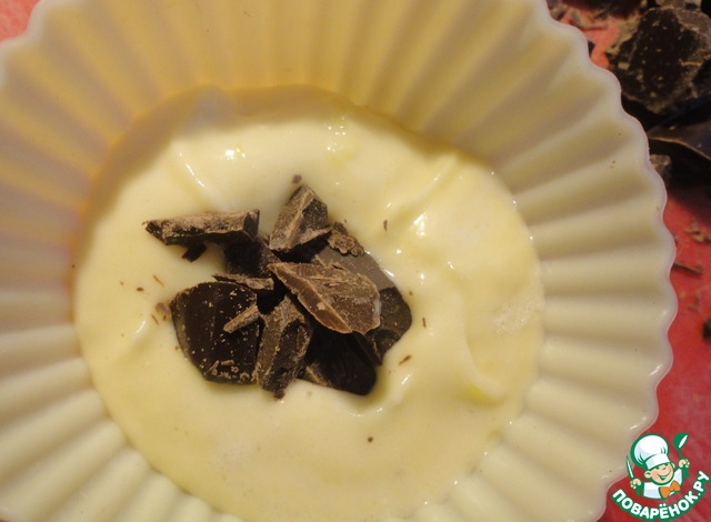 Заполняем форму примерно на треть, кладем немного шоколада.
