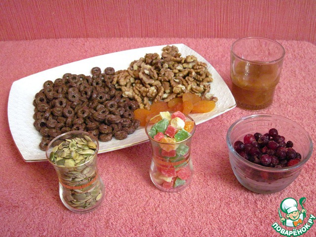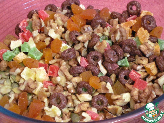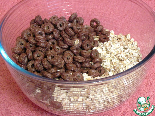 В большую миску высыпать хлопья, сухой завтрак, перемешать.