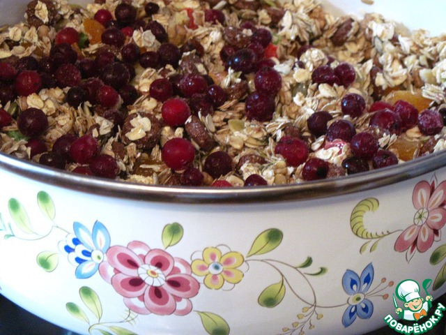 Высыпать к меду всю смесь и тщательно размешать. Добавить ягоды клюквы и смородины и еще раз осторожно перемешать.