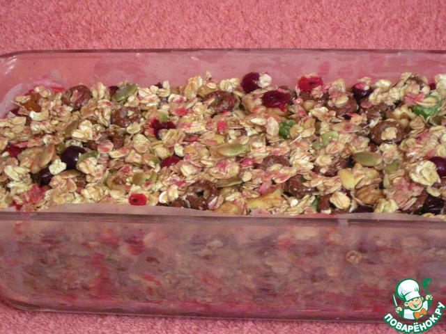 В прямоугольную форму положить промасленную бумагу. Выложить сухую смесь, плотно утрамбовывая, стараясь при этом, ягоды не давить.