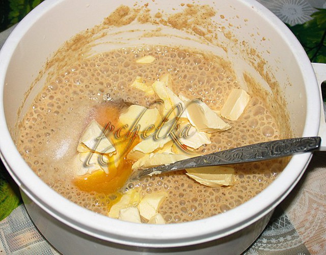 добавляем в опару остальное молоко (тёплое), яйцо, сахар и размягчённый маргарин, хорошенько размешиваем