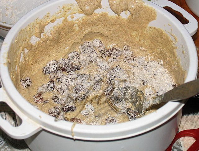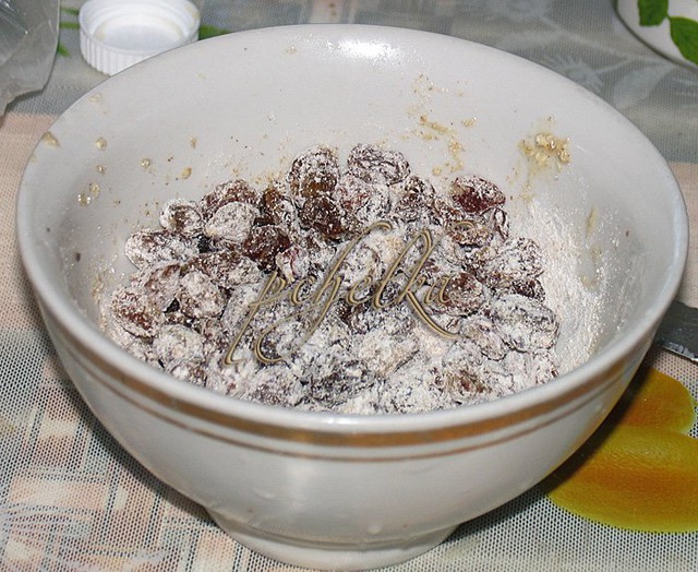 изюм отжимаем и обваливаем в муке, чтобы он равномерно распределился в тесте