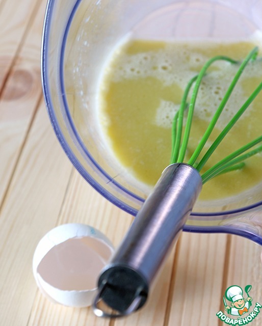 За тем смешиваем яйцо, молоко и масло.