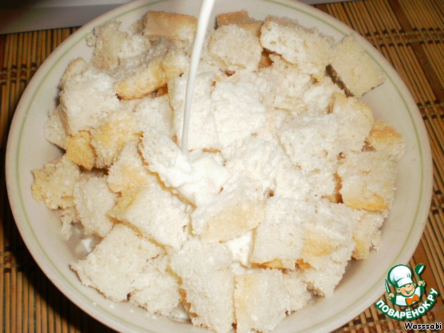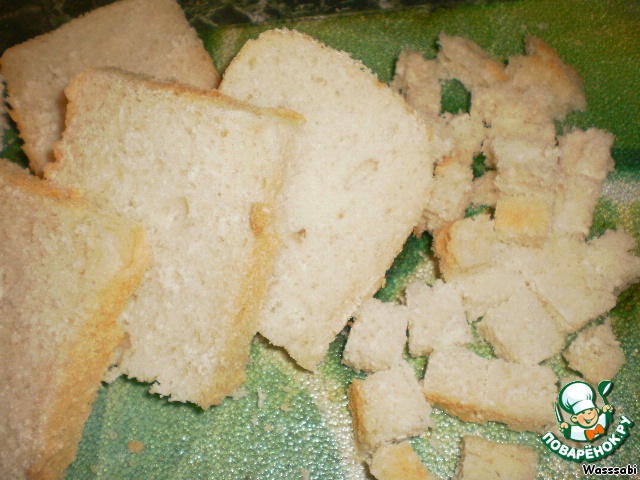 С хлеба острым ножом срезать корочки, измельчить (нарезать кубиком).