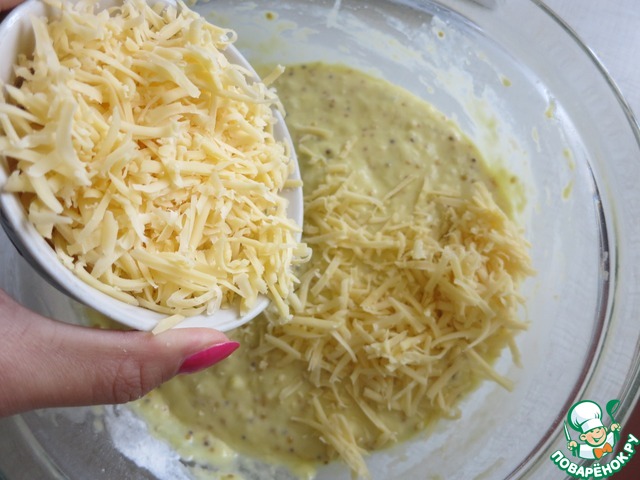 Добавить в тесто натертый сыр, измельченный тунец и аккуратно перемешать.