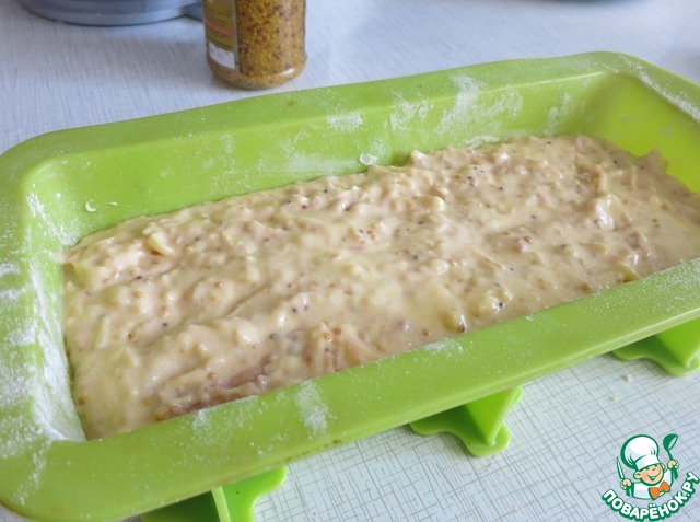 Смешать муку с разрыхлителем, вмешать яйца, растопленное сливочное масло, горчицу и молоко.