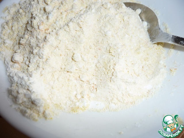 В просеянную муку добавить разрыхлитель теста, цедру апельсина, крахмал и кукурузную муку.