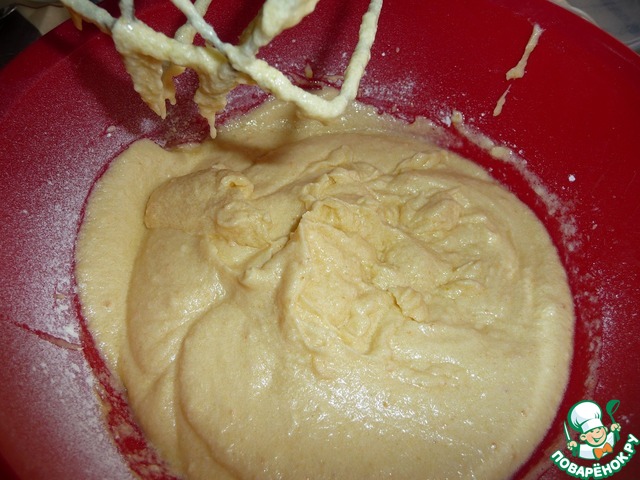 Муку добавить в масляно-яичную смесь и продолжать взбивать.